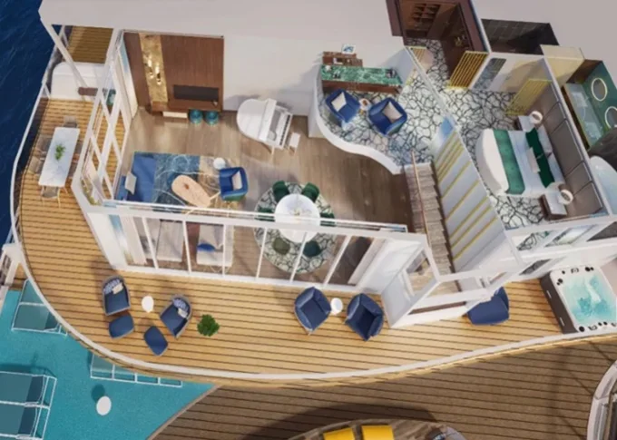 OS - Owner’s Suite 61 m² + 17,5 m² balkón s výhľadom na more. 16,17. paluba vpredu. Max 5 osôb. Výhody Royal Suite Sky class. 13 364 € 6 682 € za osobu