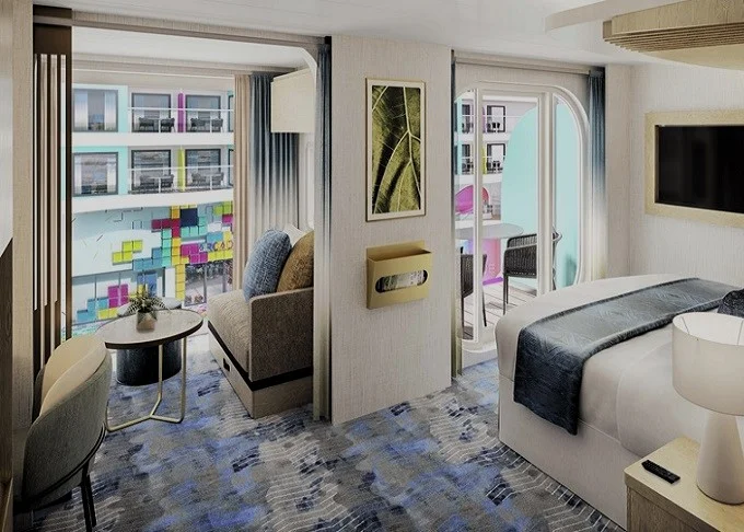 SF - Surfside Family Suite 25 m² + 5 m² balkón s výhľadom na štvrť Surfside. 9,10,11. paluba vzadu. Max 4 osoby (2 dospelé a 2 deti). Výhody Royal Suite Sky class. 7 454 € 3 727 € za osobu
