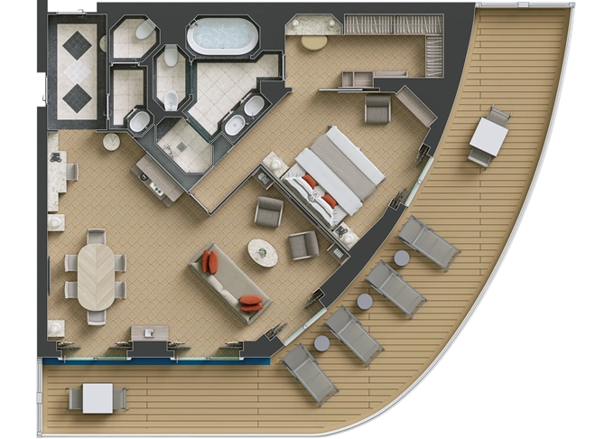 R1 - Royal Suite 1 105 m² (vrátane balkónu). 7. paluba vpredu. Max 3 osoby. 30 200 € 15 100 € za osobu