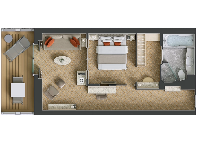 DX - Deluxe Veranda Suite 30 m² + balkón 6 m². 6,7,8. paluba - stred. Max 3 osoby. 17 600 € 8 800 € za osobu