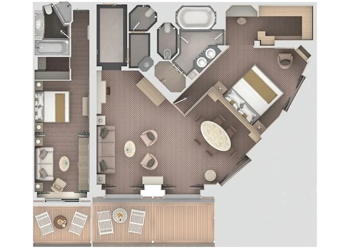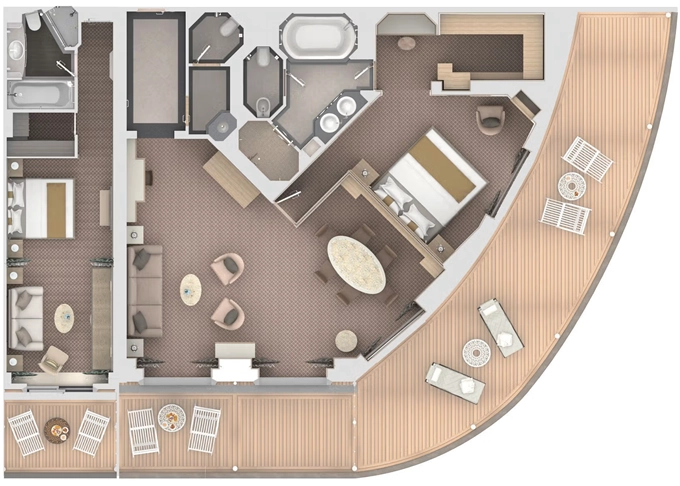 S2 - Silver Suite 2 92 m² + 12 m². Silver Suite SL spojená s Panorama Suite PA. 9,10,11. paluba. Max 5 osôb. 44 000 € 44 000 € za osobu