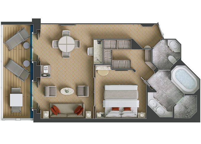 O1 - Owner's Suite 1 88 - 98 m² (vrátane balkóna 12 m²). 9. paluba - stred. Max 3 osoby. 61 200 € 20 400 € za osobu