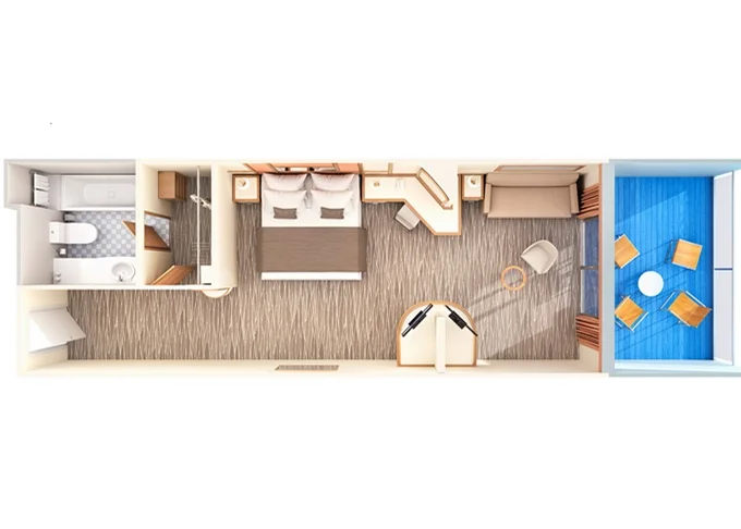 | 8A - Kajuta s balkónom 21,5 - 25,5 m² (vrátane balkóna). 8. paluba vpredu, 10. paluba vpredu, vzadu. | 1 914 € 957 € za osobu | ||