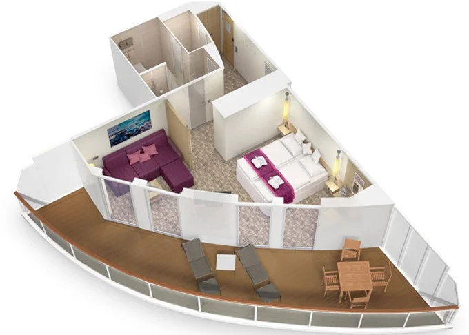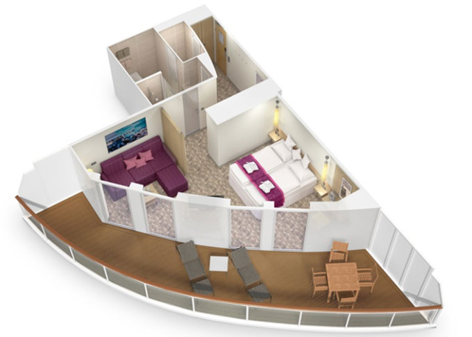 JA - Junior-Suite s balkónom PREMIUM 34 m² + terasa 27,5 m². 8. až 15. paluba. Max 4 osoby. Cenový model Premium + výhody Junior Suite. 7 480 € 3 740 € za osobu