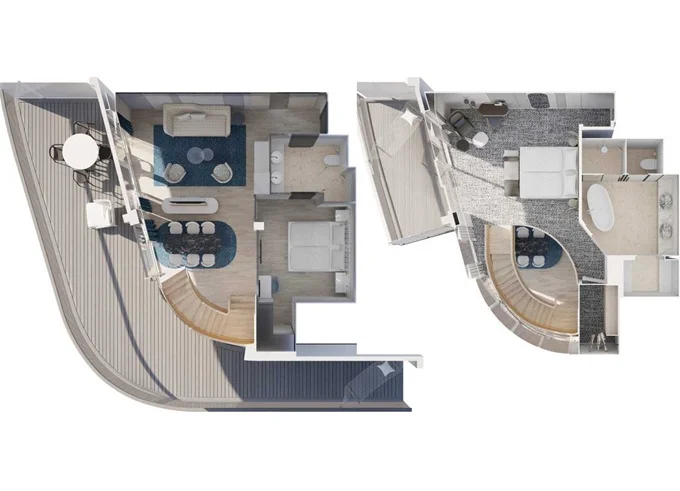 SUGO - Große Freiheit Suite 88 m² + balkón 43 m² so stolom, ležadlami + balkón s hojdacou sieťou. 2 spálne, 2 kúpeľne, šatník, infračervená sauna. 9,10. paluba. Max 6 osoby. Výhody Suite. 12 948 € 4 316 € za osobu