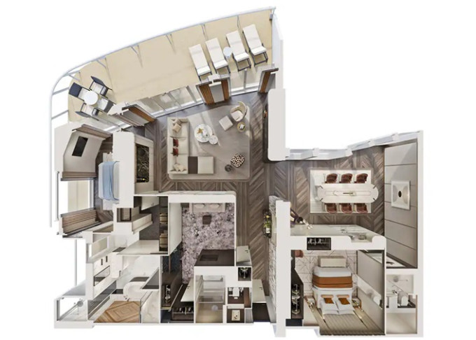 | H2 - The Haven Deluxe Owner's Suite 197 m² / balkón 45 m². 18. paluba vpredu. Max 6 osôb. Výhody The Haven. | 33 628 € 16 814 € za osobu | ||